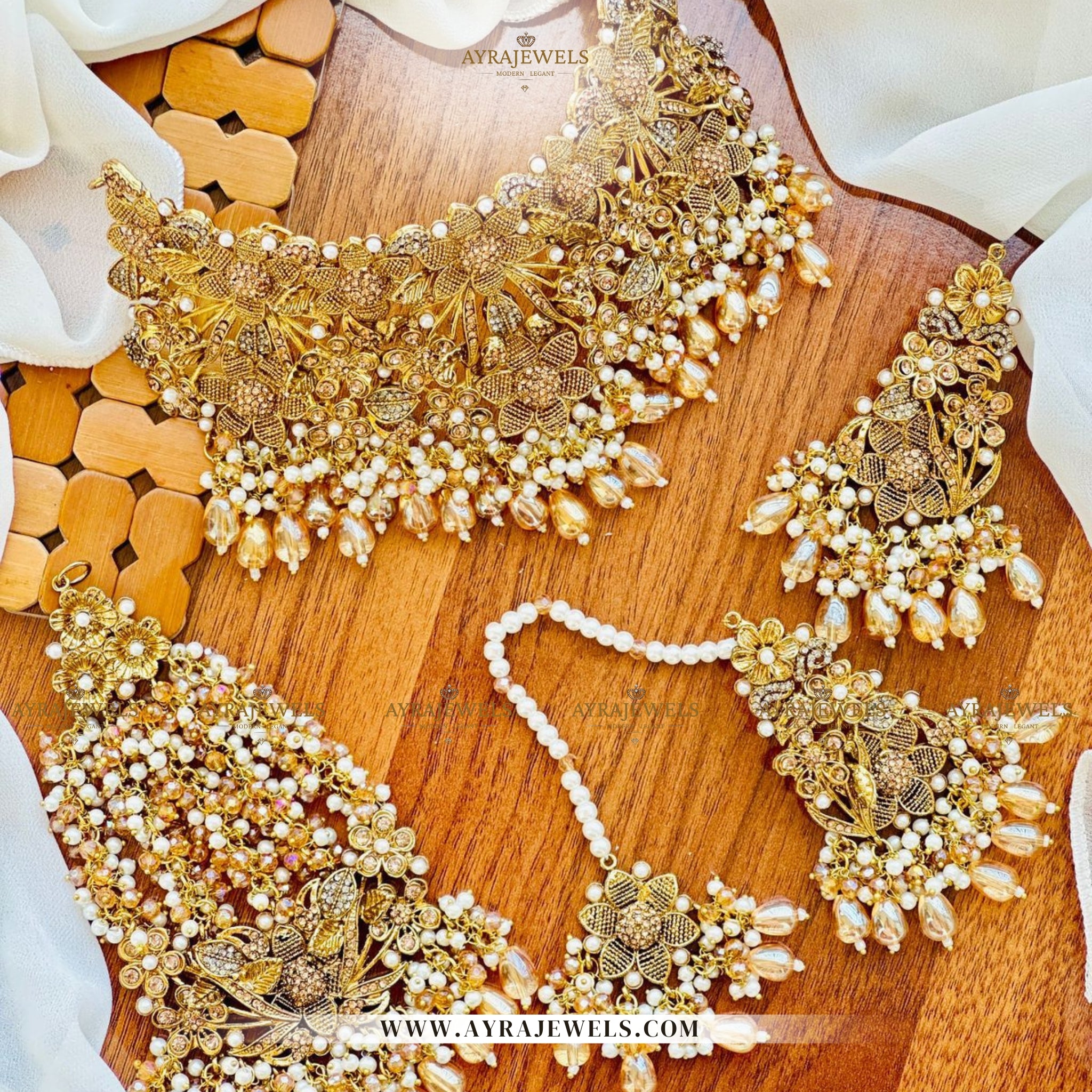 Step into your special day with confidence and elegance wearing our 3D Bridal Collar Set, a statement bridal jewellery collection designed to radiate royal charm. This stunning set includes a 3D collar-style necklace, matching earrings, a beautiful teeka, and a traditional jhoomar – everything you need to complete your bridal look in one set.