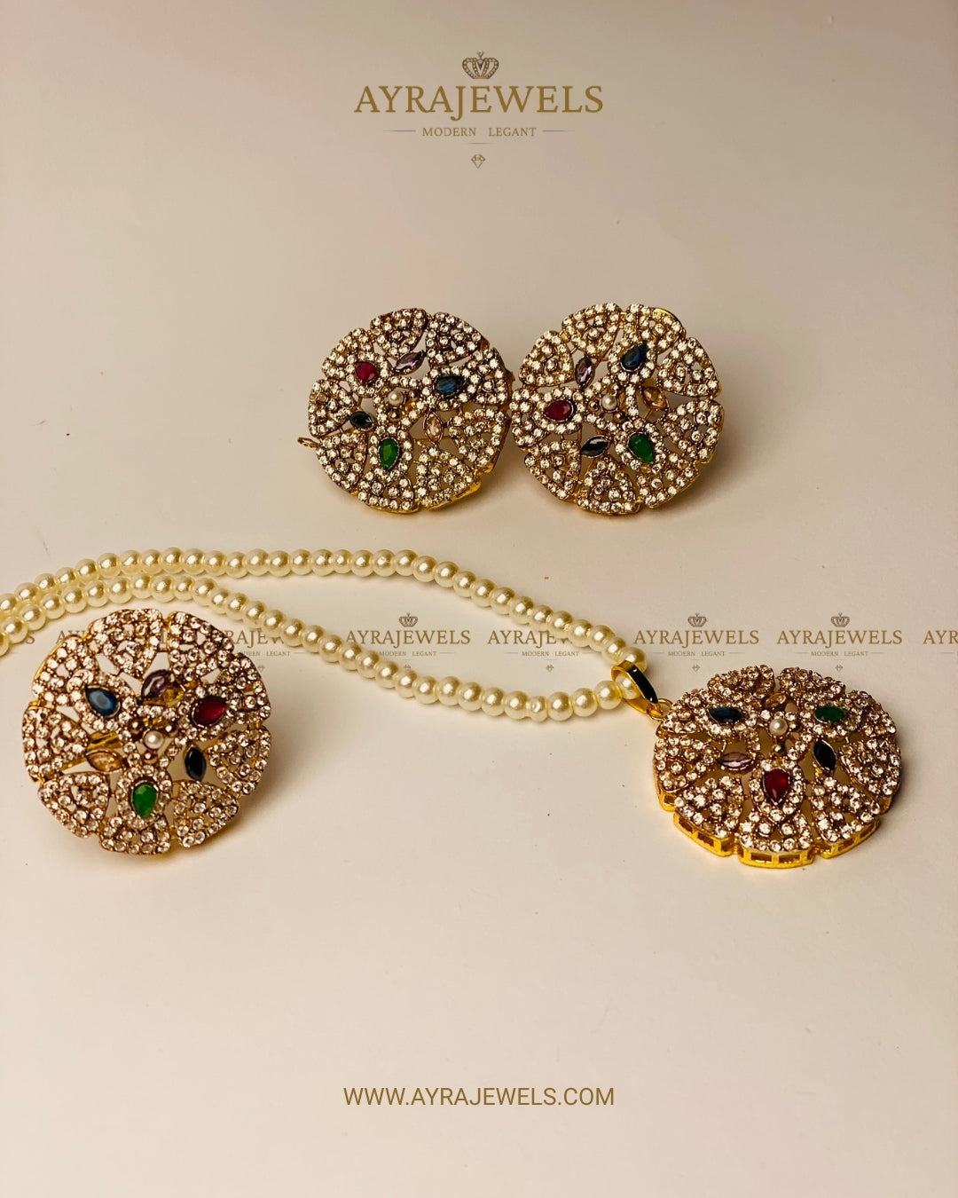 Add a pop of vibrant color and a touch of traditional luxury to your collection with this stunning jewelry set from Ayra Jewels. This set features intricate circular designs adorned with a captivating mix of white stones and brilliant, multi-colored gems, reminiscent of classic Navratna and Polki styles. The matching earrings and pendant are crafted with a delicate open-work pattern, creating a rich and opulent look. Paired with a beautiful string of pearls, this set is perfect for festive occasions, weddings, or for anyone who loves timeless, colorful jewelry.