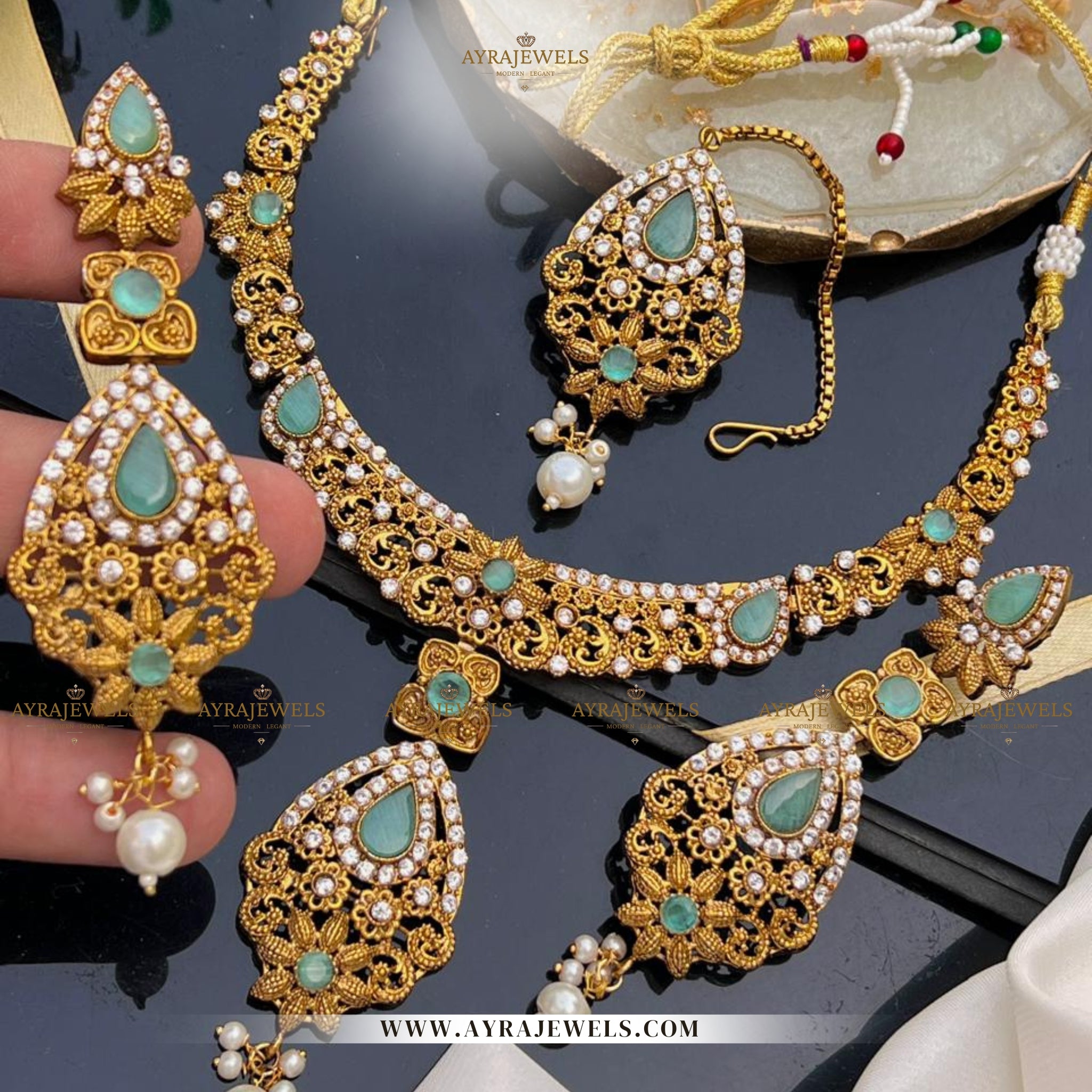 Shine bright at weddings, receptions, and festive occasions with our Zarcon Party Wear Necklace Set. Featuring a luxurious necklace, matching earrings, and a teeka, this set is crafted with high-quality zarcon stones for a sparkling, timeless finish.